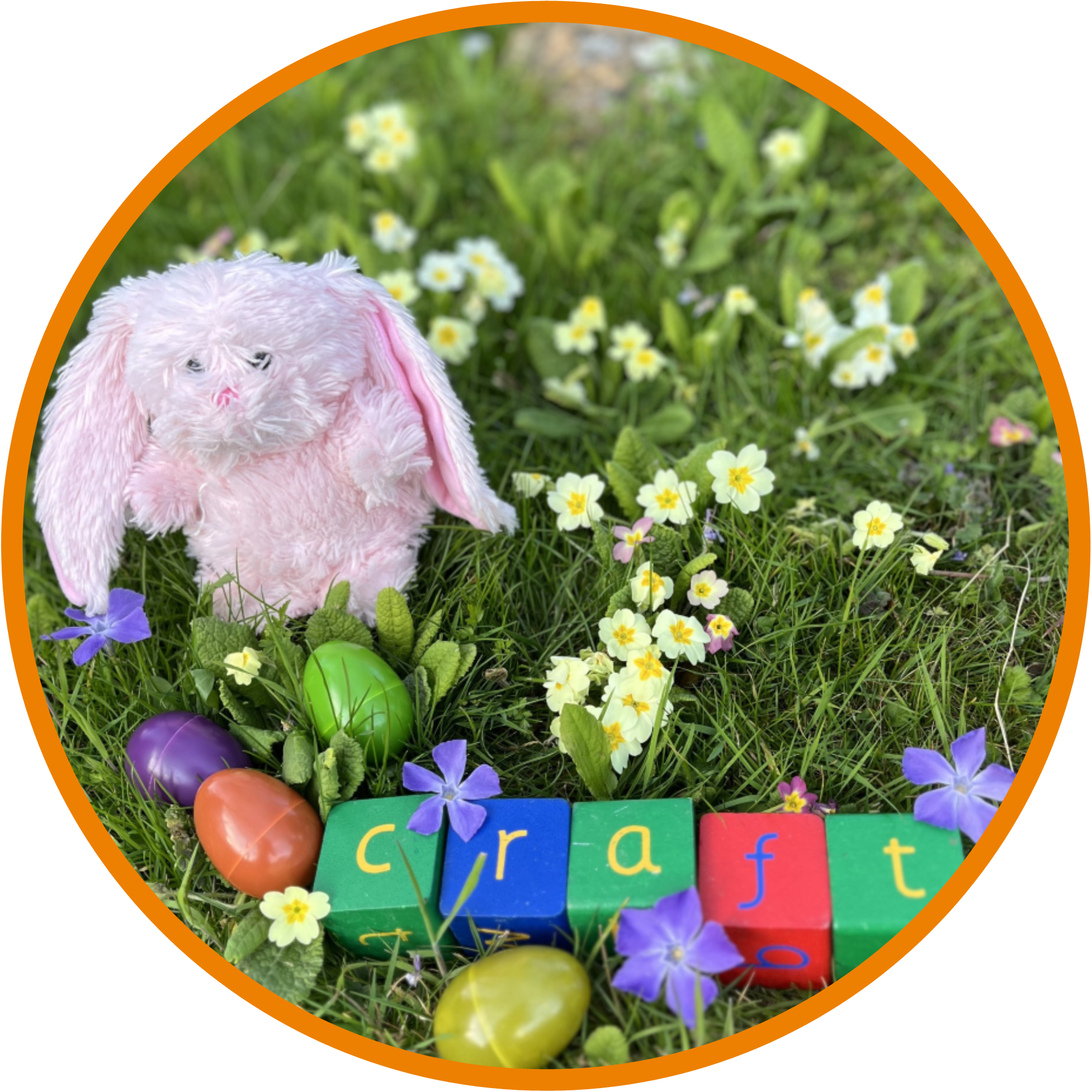 Image shows a pink bunny sat on some flowers next to the word craft